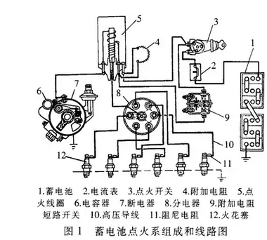 蓄電池點(diǎn)火系包括低壓和高壓電路兩部分。低壓電路由蓄電池(發(fā)電機(jī))、電流表、點(diǎn)火開關(guān)、斷電器和電容器以及點(diǎn)火線圈內(nèi)帶有附加電阻的初級(jí)繞組組成。高壓電路由點(diǎn)火線圈的次級(jí)繞組、分電器、高壓導(dǎo)線、火花塞及阻尼電阻組成,如圖1所示。